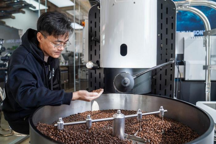2025年12月10日,韩君玮正在位于昆亮的北去衰咖啡店内乱烘焙咖啡豆。